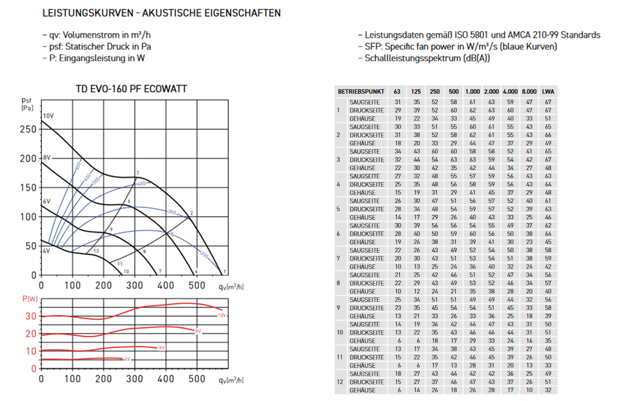 Laufräder in halbradialer Bauweise, aus ABS Kunststoff, statisch und dynamisch ausgewuchtet. EC-Motoren mit internen Thermokontakten, Motorbemessung Dauerbetrieb S1 Geschlossene Kugellager – wartungsfrei100% drehzahlregelbar über integriertes Drehzahl Potentiometer oder externen Signaleingang 0–10 V (unter 1V = Aus), Ausgang 10, Spannungsversorgung 230 V, 50/60 Hz, Schutzart IP 44, Wärmeklasse B