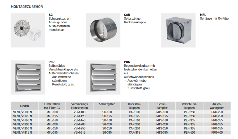 Gehäuse aus verzinktem Stahlblech. Die Ansaugstutzen zum Anschluss an Normrohre NW 100 bis 315.